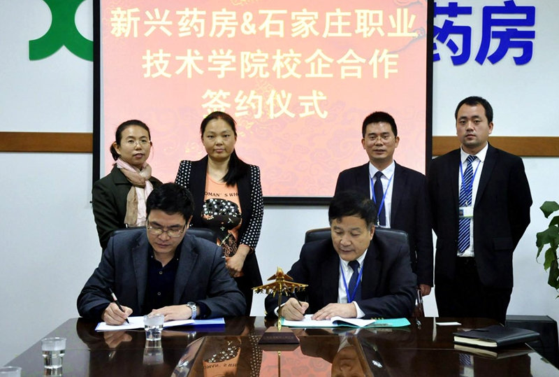 石家庄新兴药房连锁股份有限公司成立于1996年,目前拥有2500多名员工、400万会员、340多家直营门店以及8家全资子公司,是河北省最大的连锁药店。2015年销售超过9亿元。新兴药房荣获2014年度中国医药连锁药店十强,跻身2015~2016年度中国连锁药店综合实力百强榜第20位。本次签约,双方本着“优势互补、资源共享、共同发展”的原则,就订单培养、实践教学基地建设及人力资源共享等方面达成了合作意向,同时对订单培养人才培养方案、学生实习安排等细节问题进行了商讨。