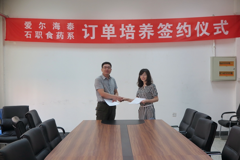 近日,食品与药品工程系与河北爱尔海泰制药有限公司签订订单培养协议。河北爱尔海泰制药有限公司办公室主任韩向红,食品与药品工程系主任陈玉峰,药品群主任尚平出席了签约仪式。